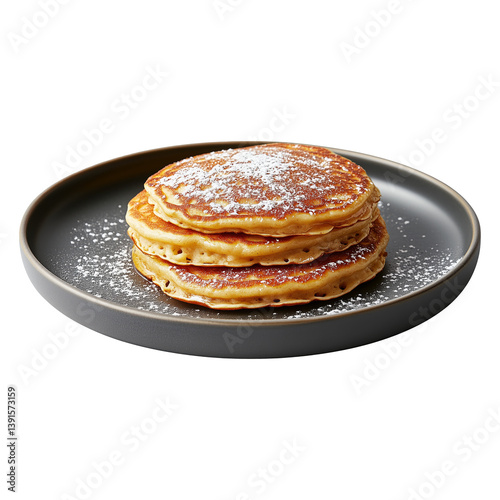 Stack of fluffy golden pancakes sprinkled with powdered sugar on a ceramic plate, isolated on white background, concept of breakfast meal