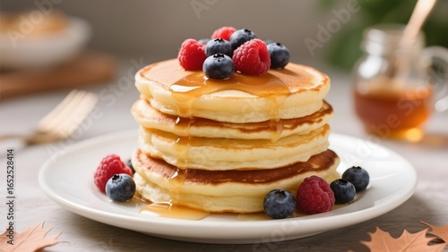 Stack of fluffy pancakes topped with fresh berries and drizzled with syrup