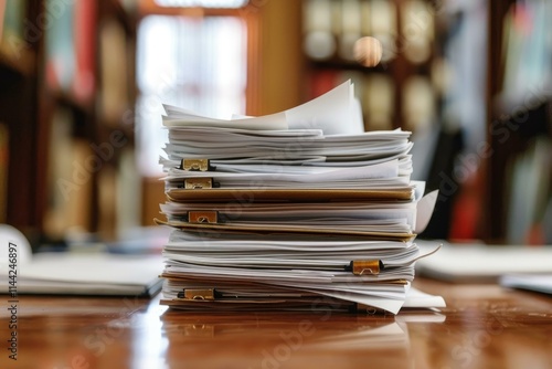 Stack of folders overflowing with paperwork sitting on a desk in an office, concept of workload