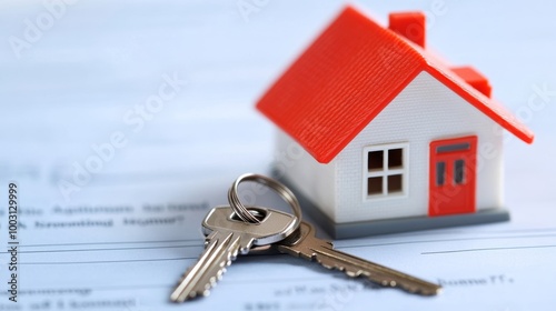 Stack of home insurance papers with a small house model and keys isolated on a white background