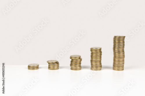 Stack of increasing coins on bright background