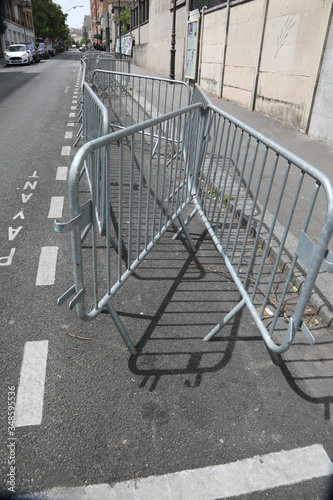 Stack of metal fences in by a street Concept big public event preparation and crowd and safety control.