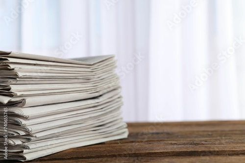 Stack of newspapers on wooden table, space for text. Journalist's work