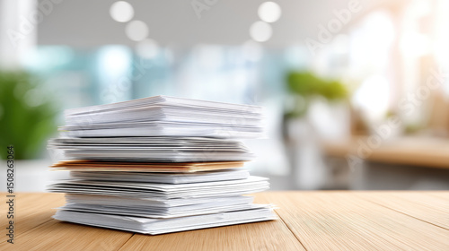 Stack of office documents on wooden desk with blurred background in bright workspace