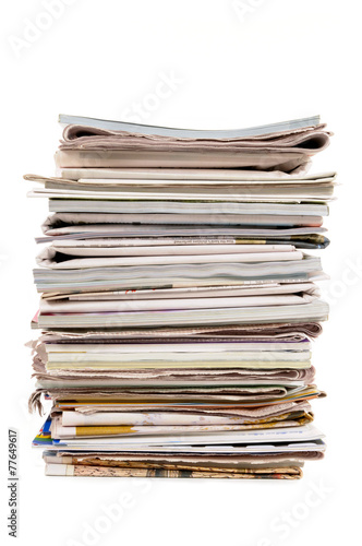 Stack of old newspapers and magazines tall vertical isolated on white background photo