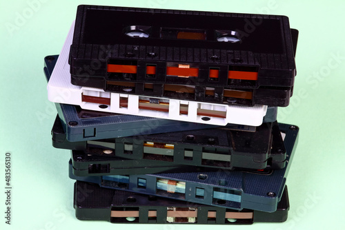 Stack of old vintage retro audio cassette tapes isolated on a green background