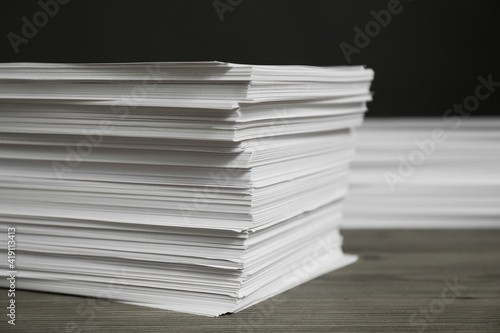 Stack of paper sheets on wooden table, closeup