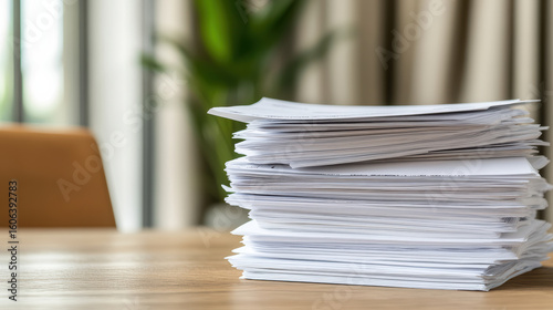 Stack of papers wooden table with blurred background of indoor plants, conveying organization