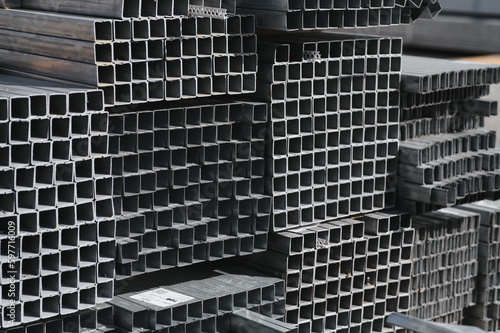 Stack of rolled metal products, perspective view of steel pipes of rectangular cross-section