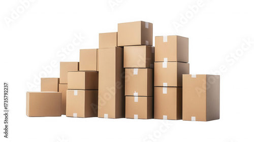 Stack of sealed cardboard boxes ready for shipping on transparent background