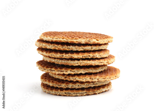 Stack of tasty round waffles isolated on white
