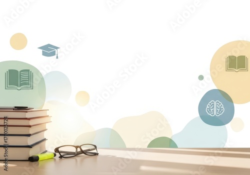Stack of textbooks and glasses on a desk with abstract shapes, perfect for educational background or exam concept.