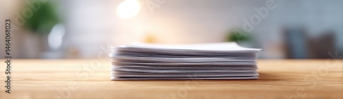 Stack of White Paper Sheets on Wooden Table in Soft Light Environment