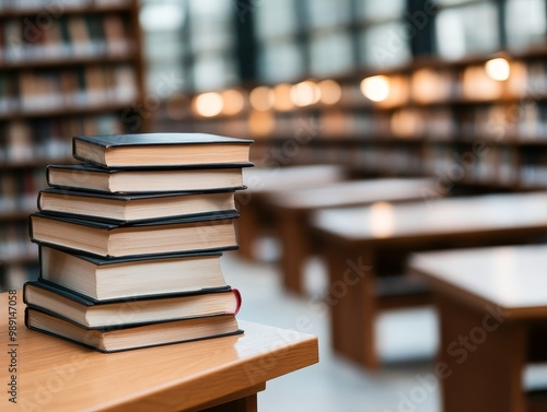 Stacked Books in a Cozy Library Setting with Bookshelves