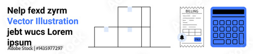Stacked boxes representing inventory, a billing receipt, and a calculator for warehouse logistics. Ideal for e-commerce, accounting, logistics, shipping, supply chain, retail simple landing page