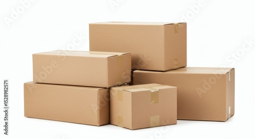 Stacked Brown Boxes Packaging with Delivery, and Moving White Background.