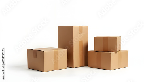 Stacked brown cardboard boxes in various sizes arranged on a white background