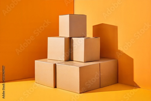 Stacked Cardboard Boxes Against Vibrant Orange Background