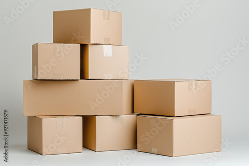 Stacked cardboard boxes for packaging, white background, no shadows, no reflections, no lighting effects, product photography, high resolution