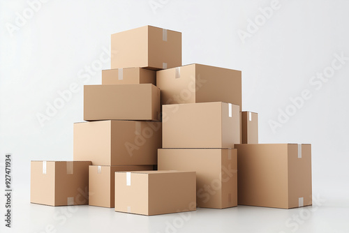 Stacked cardboard boxes for packaging, white background, no shadows, no reflections, no lighting effects, product photography, high resolution