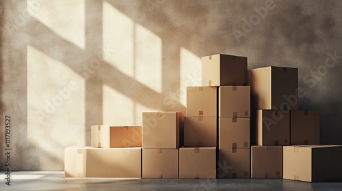 Stacked Cardboard Boxes in a Sunlit Room with Soft Shadows