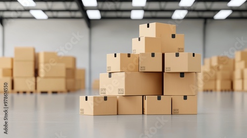 Stacked cardboard boxes in warehouse. Concept of logistics, shipping, and storage management.