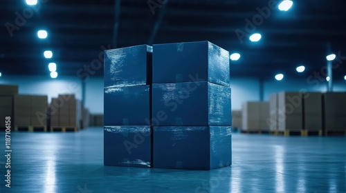 Stacked Cardboard Boxes in Warehouse with Dim Lighting and Industrial Background