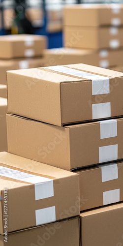 Stacked cardboard boxes neatly arranged in a warehouse for storage and organization purposes