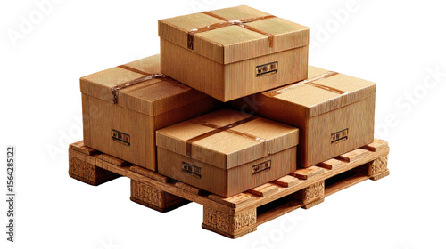 Stacked Cardboard Boxes on Pallet: Securely packaged cardboard boxes, tied with twine, sit neatly stacked on a wooden pallet, ready for shipment or storage.