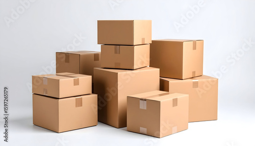 Stacked Cardboard Boxes on White Background, Ready for Moving or Shipping