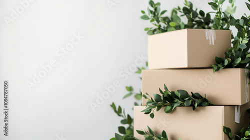 Stacked cardboard boxes surrounded by greenery in a minimalistic indoor setting