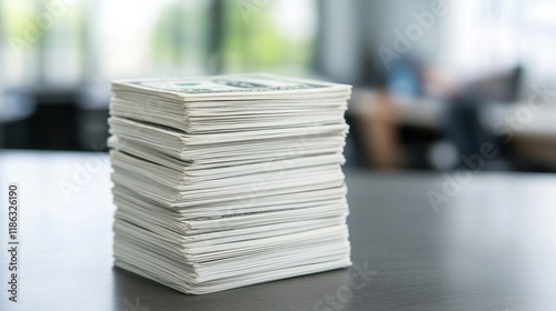 Stacked Cash Bundles on a Business Desk in an Office Setting with Natural Light Streaming Through Windows