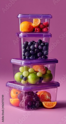 Stacked clear plastic containers, each filled with different colorful fruits and berries, arranged on a vibrant purple background. Fresh, healthy, and organized
