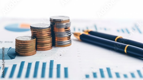 Stacked coins and pens on financial charts showing economic data, representing investment, growth, and financial analysis.