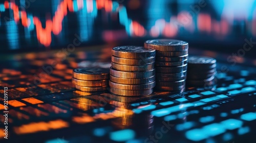 Stacked Coins on Digital Financial Chart Background Representing Cryptocurrency and Stock Market Trends
