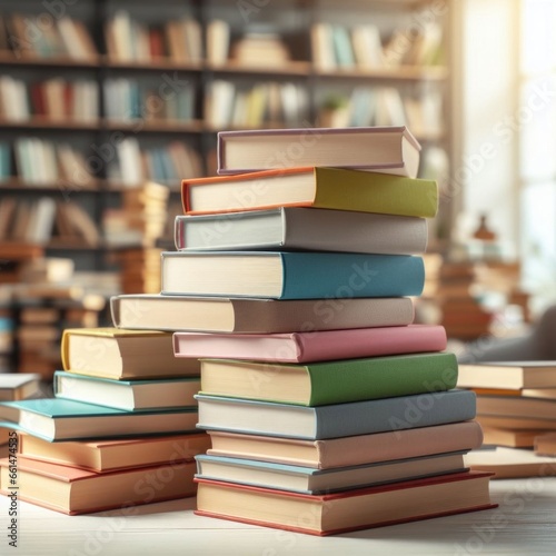 Stacked colorful books on white wooden table with blurred colorful arrangement of books and bookshelf background.