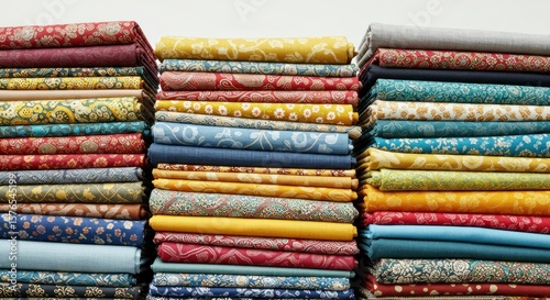 Stacked colorful fabric bolts, various patterns and colors, ready for crafting.