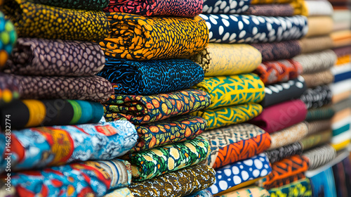 Stacked colorful fabrics displayed for sale in a shop setting.