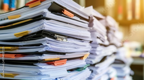 Stacked Documents with Colorful Clips in Modern Office Setting Under Natural Light