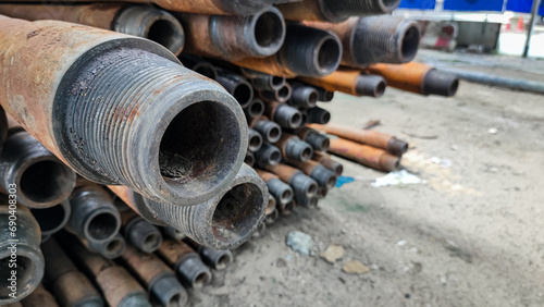 Stacked drill pipe or drill stem, used drilling rusty metal pipes