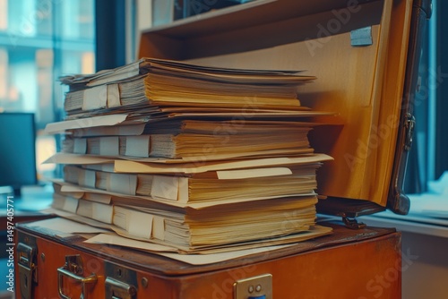Stacked Folders and Files in an Open Briefcase on a Desk