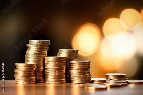 Stacked gold coins shine against a warm, blurred background, symbolizing wealth, investment, and prosperity in a financial context.