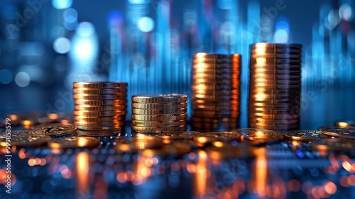 stacked gold coins with financial graph, investment and wealth growth in digital economy, rising money bar chart with coins, wealth growth with coins, investment performance visual