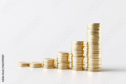 Stacked golden coins arranged in ascending order on a clean white background showcasing wealth growth