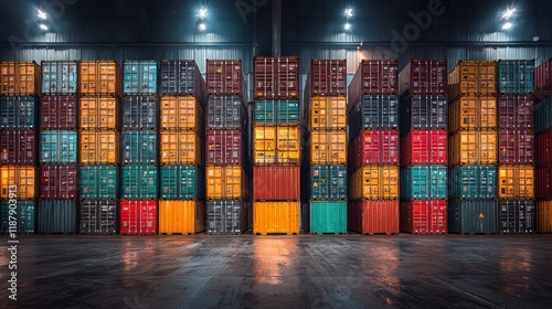 Stacked shipping containers in a warehouse setting.