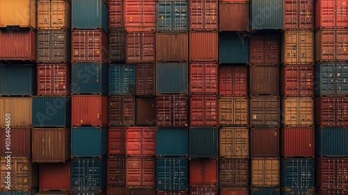 Stacked shipping containers in vibrant colors, showcasing global trade and industrial logistics in a bustling port.