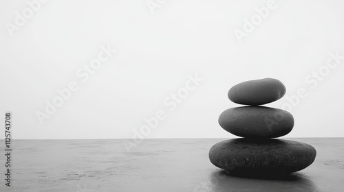 Stacked zen stones in varying shapes and sizes on a smooth, reflective surface, set against a minimalist white backdrop, tranquility, meditation, wellness, balance.