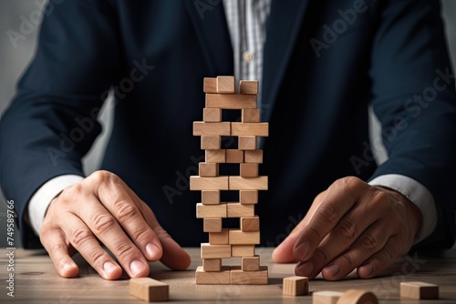 Stacking Wooden Blocks for Business Growth. Male Hand Achieving Success in Building a Tower