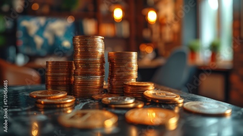 Stacks of coin incrementally increasing in size on a dark office table, representing financial growth or savings concept.