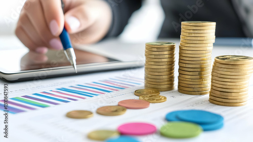 Stacks of Coins with Financial Data and Tablet in Business Setting
